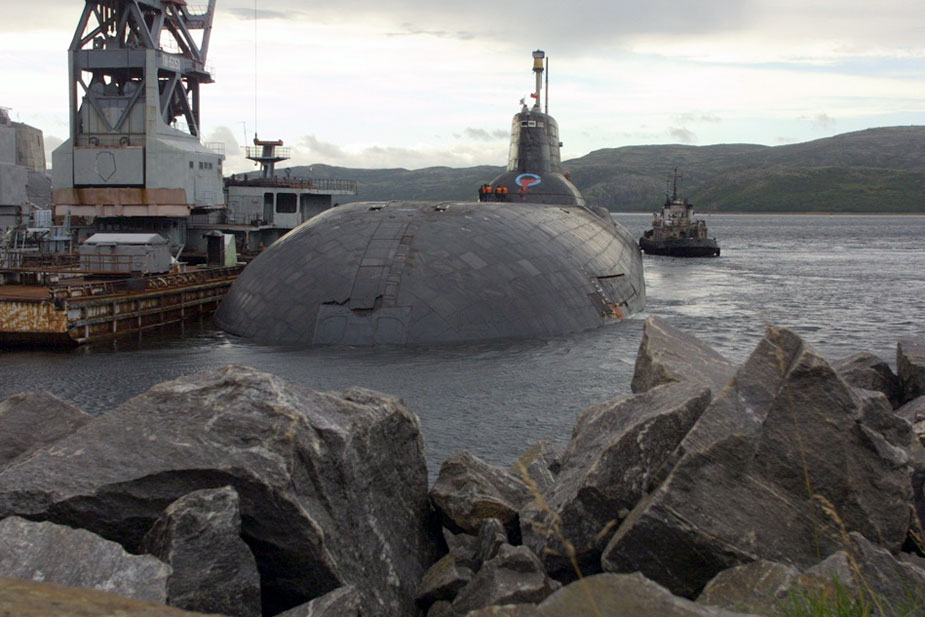 圖為停靠碼頭的俄軍臺(tái)風(fēng)級(jí)巨獸核潛艇。