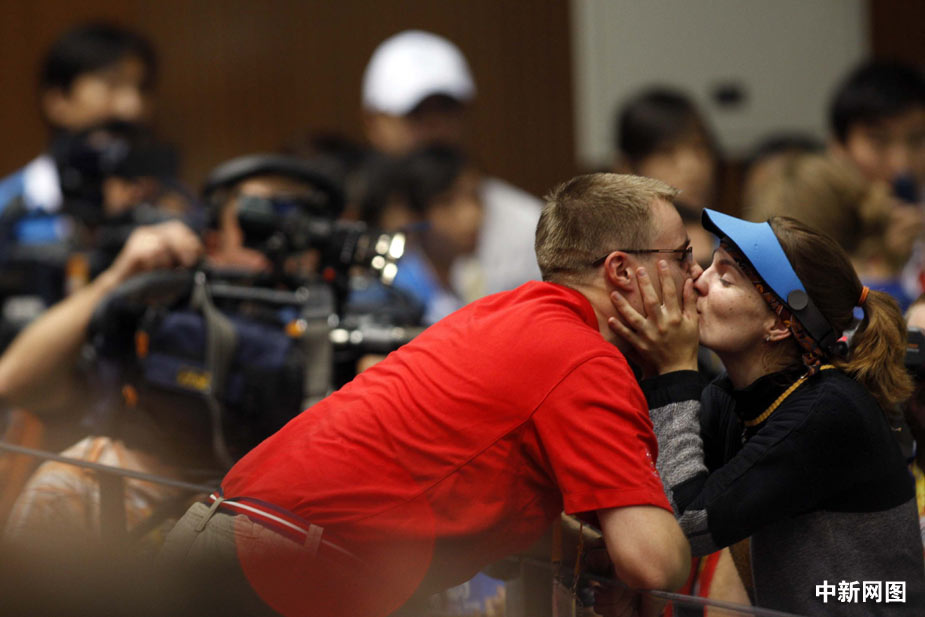 擊落頭金—— 8月9日,北京奧運會開賽的第一天,女子10米氣步槍決賽在北京射擊館進行。捷克選手卡特日娜·埃蒙斯以503.5環(huán)獲得金牌,同時也是本屆奧運會產(chǎn)生的首枚金牌。圖為埃蒙斯獲勝后親吻丈夫。
