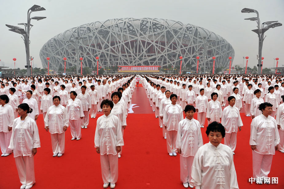 8月8日,全國首個“全民健身日”北京主會場啟動儀式上,三萬多群眾進行太極拳展示活動,在世界吉尼斯總部認證官員的見證下成功打破世界紀錄。中新網(wǎng)記者 金碩 攝