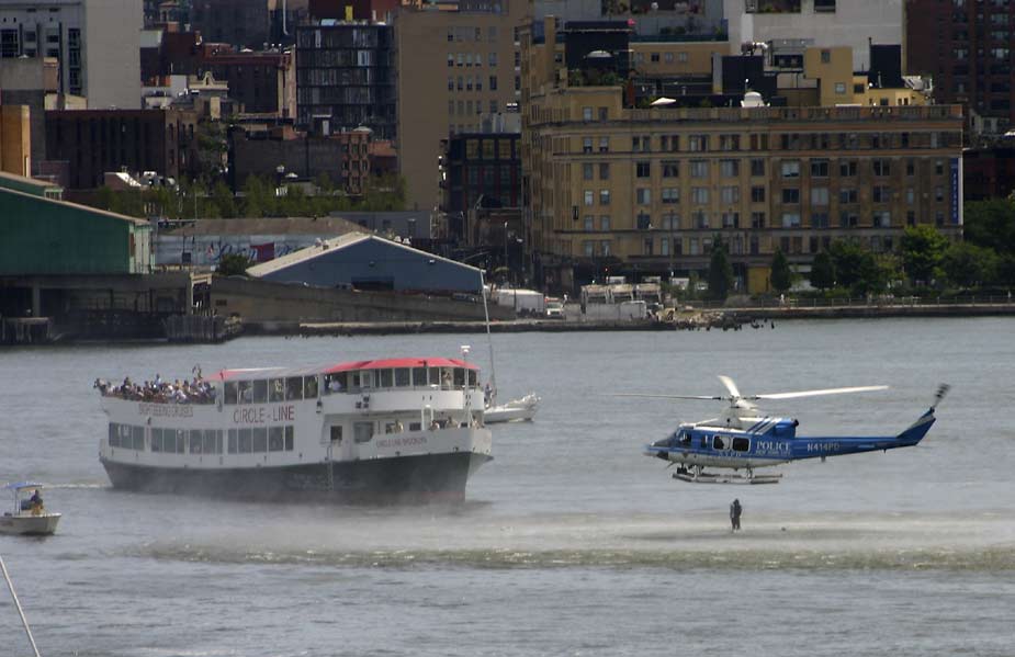 8月8日,紐約市曼哈頓西側(cè)的哈德遜河上空,一架觀光直升飛機(jī)和一架小型飛機(jī)相撞,兩飛機(jī)雙雙墜入河中。據(jù)稱觀光直升飛機(jī)上載有五名意大利游客和一名飛行員,而小型飛機(jī)上則有三人。圖為救援直升機(jī)在現(xiàn)場搜救。