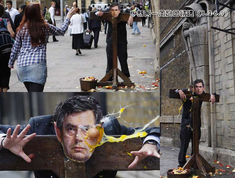 8月6日,英國倫敦,英國首相布朗的頭像被安放在街頭的一處“斷頭臺”上,被過往的行人用雞蛋砸。點(diǎn)擊觀看詳細(xì)內(nèi)容