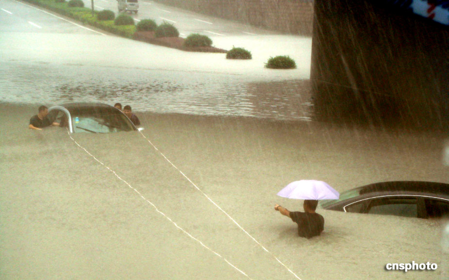 8月9日,在浙江溫州市區(qū)湯家橋路段,兩輛轎車被積水淹沒,救援人員正在進(jìn)行施救。中新社發(fā) 吳水斌 攝