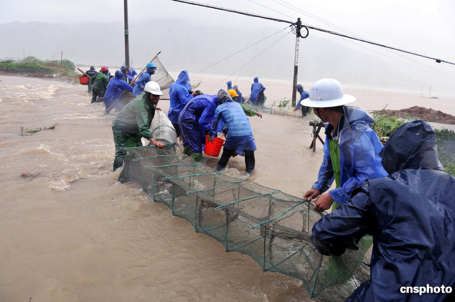 8月9日,福建省霞浦縣牙城鎮(zhèn)洪山村村民和武警官兵一起在洪水中搶收養(yǎng)殖的海魚。中新社發(fā) 王東明 攝