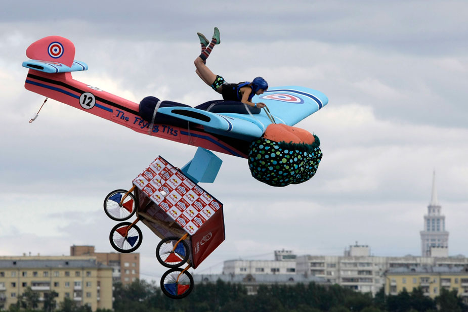 8月9日,莫斯科河畔舉辦一年一度的“墜落節(jié)”,表演者帶著自己設(shè)計(jì)制作的各種“飛行器”勇敢的從高空跳入水中。