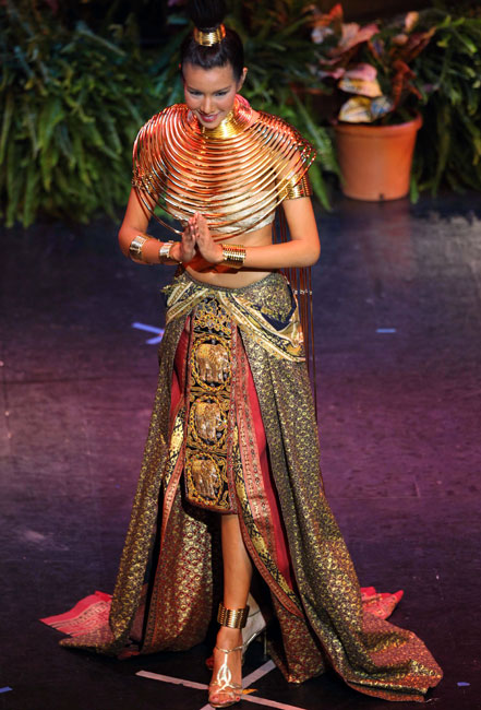 8月10日,2009年世界小姐大賽上,來(lái)自84個(gè)國(guó)家和地區(qū)的佳麗進(jìn)行民族服飾的展示,各國(guó)佳麗分別穿著含有自己民族風(fēng)格元素的時(shí)尚晚裝亮相,現(xiàn)場(chǎng)頓時(shí)色彩斑斕,美不勝收。