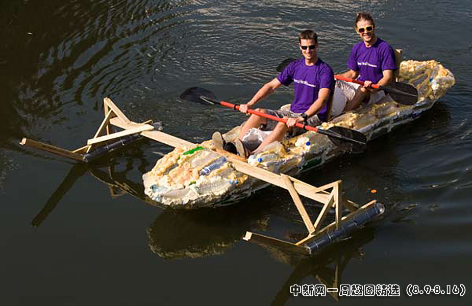 8月8日,來自新西蘭的木匠Campbell Holm和他的伙伴劃著一條由回收的塑料瓶制作的小船。點(diǎn)擊觀看詳細(xì)內(nèi)容