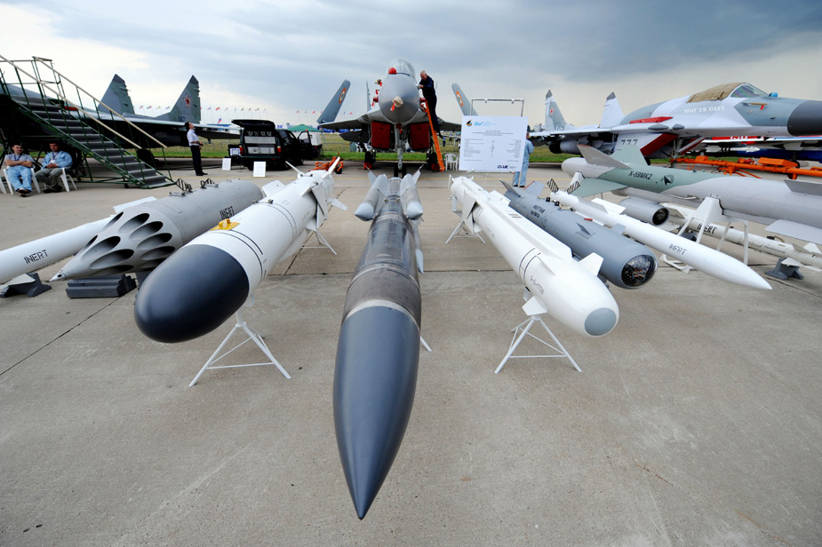8月18日,2009莫斯科國(guó)際航空航天展(MAKS-2009)開(kāi)幕。圖為展出的殲擊機(jī)和攜帶的導(dǎo)彈。
