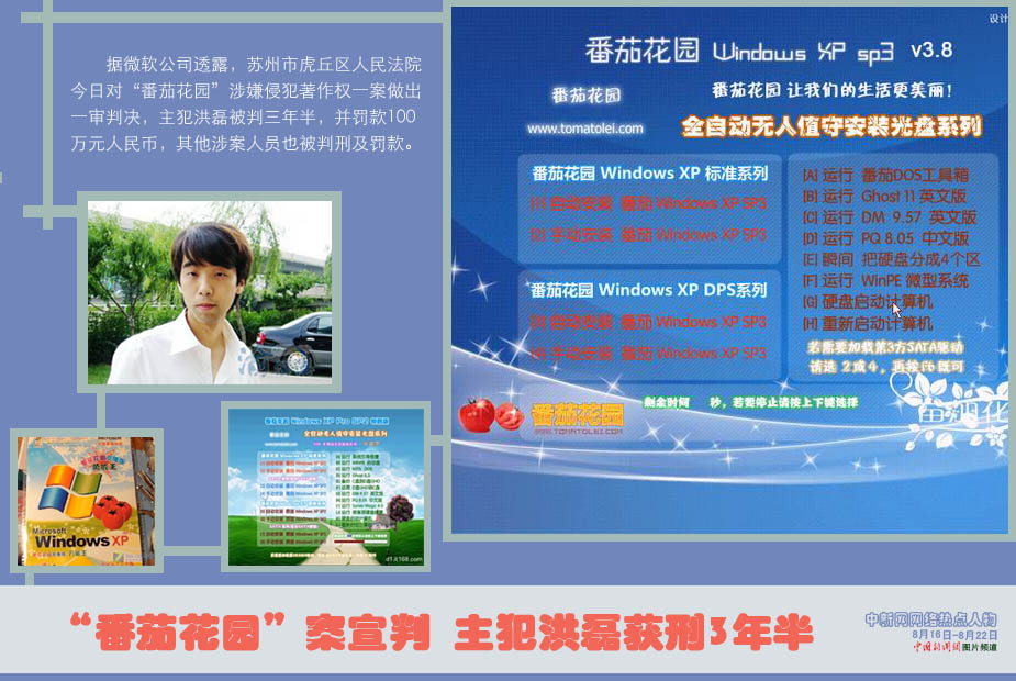 中新網(wǎng)本周熱點人物之——洪磊 微軟公司透露,蘇州市虎丘區(qū)人民法院今日對“番茄花園”涉嫌侵犯著作權(quán)一案做出一審判決,主犯洪磊被判三年半,并罰款100萬元人民幣,其他涉案人員也被判刑及罰款。