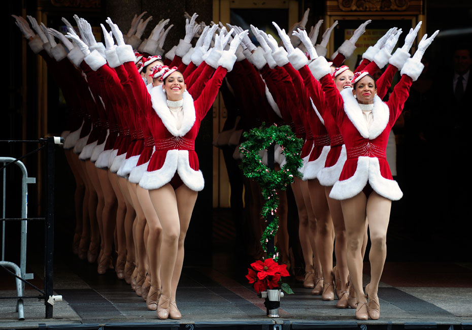 8月25日,美國(guó)“火箭女郎”舞蹈團(tuán)身著圣誕裝在無(wú)線電城音樂(lè)廳(Radio City Music Hall)前演出。來(lái)源:中國(guó)新聞網(wǎng)