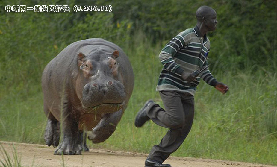 烏干達獵場一只大河馬在吃午餐時遭到一名看守人打擾,河馬怒了,突然沖了出來,看守人被嚇得落荒而逃。圖片來源:中國新聞網(wǎng)