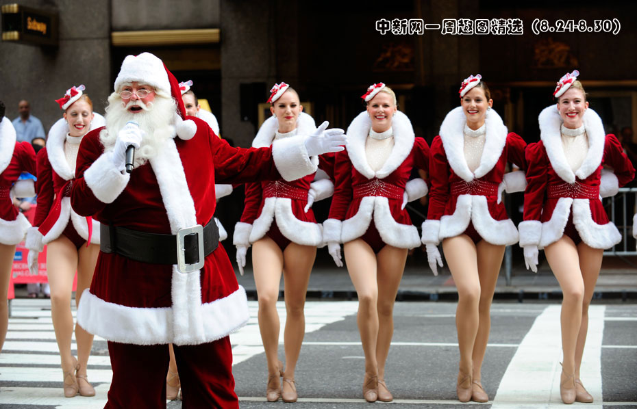 8月25日,美國(guó)“火箭女郎”舞蹈團(tuán)身著圣誕裝在無(wú)線電城音樂(lè)廳(Radio City Music Hall)前演出。圖片來(lái)源:中國(guó)新聞網(wǎng)