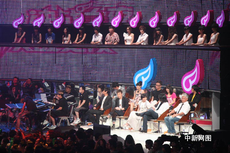 9月4日,湖南衛(wèi)視“2009快樂女聲”進(jìn)行最后的總決賽。江映蓉、黃英、李霄云這3強(qiáng)選手將通過18首歌曲的演繹,向全國總冠軍發(fā)起最后沖擊。圖為現(xiàn)場的評(píng)審。劉雙雙攝