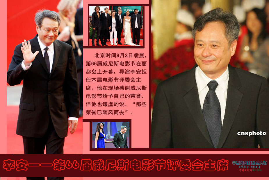 中新網(wǎng)本周熱點(diǎn)人物之——李安 北京時間9月3日凌晨,第66屆威尼斯電影節(jié)在麗都島上開幕,導(dǎo)演李安擔(dān)任本屆電影節(jié)評委會主席。他在現(xiàn)場感謝威尼斯電影節(jié)給予自己的榮譽(yù),但他也謙虛的說,“那些榮譽(yù)已隨風(fēng)而去”。來源:中國新聞網(wǎng)、新京報(bào)
