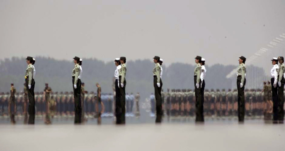 在熱浪中,三軍女兵方隊在進行訓練(7月3日攝)。王建民 攝
