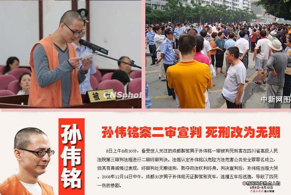 中新網(wǎng)本周熱點(diǎn)人物之——孫偉銘 8日上午8點(diǎn)30分,備受世人關(guān)注的成都醉駕男子孫偉銘一審被判死刑案在四川省高級(jí)人民法院第三審判法庭進(jìn)行二審終審判決。法庭認(rèn)定孫偉銘以危險(xiǎn)方法危害公共安全罪罪名成立,但其有真誠(chéng)悔過(guò)表現(xiàn),終審判處無(wú)期徒刑,剝奪政治權(quán)利終身。判決宣判后,孫偉銘當(dāng)庭大哭。2008年12月14日中午,成都30歲男子孫偉銘無(wú)證醉駕別克車(chē),連撞五車(chē)后逃逸,導(dǎo)致了四死一傷的慘劇。