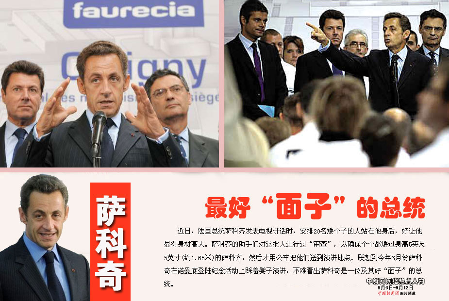 中新網(wǎng)本周熱點人物之——薩科奇 近日,法國總統(tǒng)薩科齊發(fā)表電視講話時,安排20名矮個子的人站在他身后,好讓他顯得身材高大。薩科齊的助手們對這批人進行過“審查”,以確保個個都矮過身高5英尺5英寸(約1.65米)的薩科齊,然后才用公車把他們送到演講地點。聯(lián)想到今年6月份薩科奇在諾曼底登陸紀(jì)念活動上踩著凳子演講,不難看出薩科奇是一位及其好“面子”的總統(tǒng)。