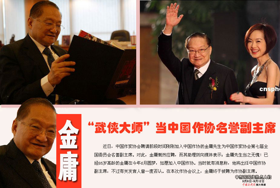 中新網(wǎng)本周熱點(diǎn)人物之——金庸 近日,中國(guó)作家協(xié)會(huì)聘請(qǐng)前段時(shí)間剛剛加入中國(guó)作協(xié)的金庸先生為中國(guó)作家協(xié)會(huì)第七屆全國(guó)委員會(huì)名譽(yù)副主席。對(duì)此,金庸慨然應(yīng)聘,而其助理則向媒體表示:金庸先生當(dāng)之無(wú)愧!已經(jīng)85歲高齡的金庸在今年6月圓夢(mèng),如愿加入中國(guó)作協(xié)。當(dāng)時(shí)就有消息稱,他將出任中國(guó)作協(xié)副主席,不過(guò)有關(guān)發(fā)言人曾一度否認(rèn)。在本次作協(xié)會(huì)議上,金庸終于被聘為作協(xié)副主席。