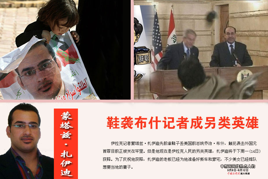 中新網(wǎng)本周熱點人物之——蒙塔茲·扎伊迪 伊拉克記者蒙塔茲·扎伊迪先前拿鞋子丟美國前總統(tǒng)喬治·布什,觸犯襲擊外國元首罪目前正被關(guān)在牢里。但是他現(xiàn)在是伊拉克人民的另類英雄,扎伊迪將于下周一(14日)獲釋。為了慶祝他獲釋,扎伊迪的老板已經(jīng)為他準備好新車和豪宅,不少美女已經(jīng)排隊想要當他的妻子。