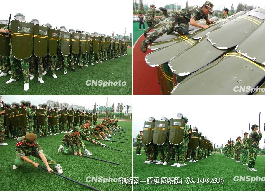 9月18日,江蘇省揚州大學(xué)廣陵學(xué)院新生軍訓(xùn)拉開序幕。與往年不同的是,該校今年軍訓(xùn)增加了反恐防暴。圖片來源:中國新聞網(wǎng)