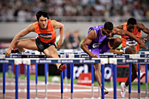 圖為賽場(chǎng)上的翔飛人。在20日晚進(jìn)行的上海田徑大獎(jiǎng)賽的男子110米欄的比賽中,劉翔時(shí)隔13個(gè)月后重返賽場(chǎng),并跑出13秒15的成績(jī)。美國(guó)名將特拉梅爾以13秒15的同樣成績(jī)、近乎為零的優(yōu)勢(shì)奪走冠軍。