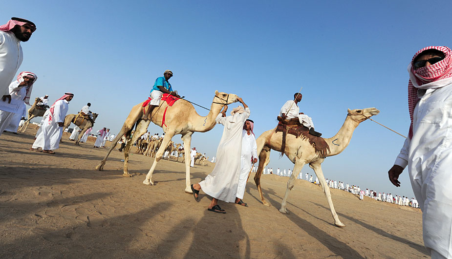9月25日,在沙特阿拉伯東部的哈利斯,駱駝騎士們騎著自己的座駕在大漠中飛馳。圖片來源:中國新聞網(wǎng)