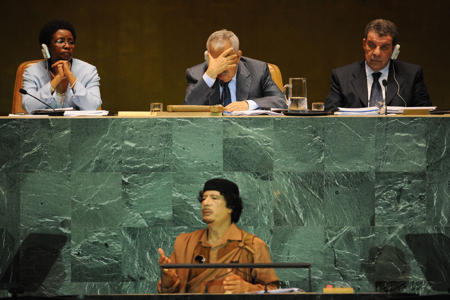執(zhí)政40年來(lái)首次在聯(lián)合國(guó)亮相的利比亞領(lǐng)導(dǎo)人卡扎菲,23日在聯(lián)大一般性辯論上發(fā)表演講,強(qiáng)力攻擊安理會(huì)和聯(lián)合國(guó)的現(xiàn)有體制,并將原定15分鐘的演講拖到一個(gè)半小時(shí),很多國(guó)家代表團(tuán)成員最后堅(jiān)持不住,紛紛離開會(huì)議現(xiàn)場(chǎng)。圖片來(lái)源:中國(guó)新聞網(wǎng)