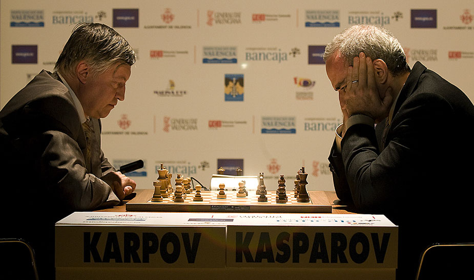 在本周,國際象棋界的兩位大師卡爾波夫(左)與卡斯帕羅夫在西班牙的巴倫西亞市開始了一場中斷25年的比賽。25年前,他們在爭奪世界冠軍的比賽中激戰(zhàn)5個月未分勝負(fù)。目前卡斯帕羅夫以2比0領(lǐng)先。圖片來源:中國新聞網(wǎng)