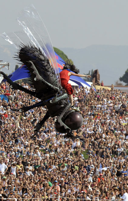 9月27日,法國(guó)馬賽趣味飛行器大賽舉行。比賽規(guī)則簡(jiǎn)單,誰(shuí)能在落水之前飛得更遠(yuǎn)誰(shuí)就是冠軍,但參賽選手絞盡腦汁,把自己的飛行器扮成各種古怪摸樣。圖片來(lái)源:中國(guó)新聞網(wǎng)