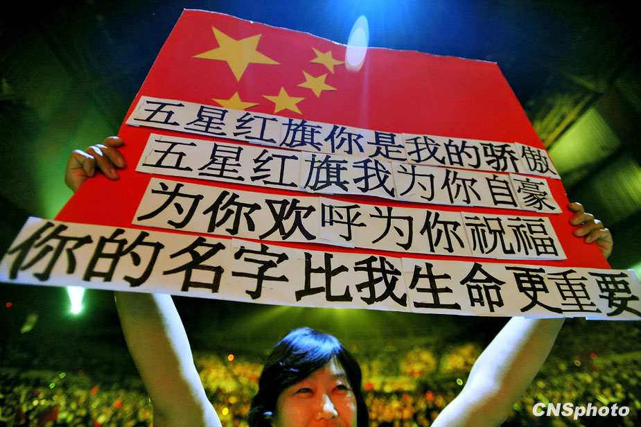 當(dāng)?shù)貢r間9月20日,以“感動世界,中國有我”為主題的全球華人共慶新中國成立六十周年《同一首歌》——走進美國舊金山大型演唱會圓滿落幕。 一位宮姓女士自制了一面五星紅旗,用獨特的方式祝福新中國六十華誕。 中新社發(fā) 陳鋼 攝