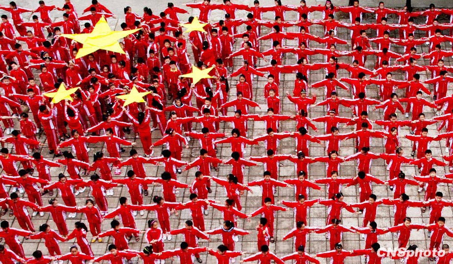9月22日,江西省德興市銅礦第二小學(xué)1000多名小學(xué)生,身穿紅色校服,排列整齊的在校園內(nèi)組成了一個(gè)長42米、寬28,總面積達(dá)1170多平方米的巨型國旗,為迎接建國60周年喝彩,同時(shí)也讓同學(xué)們上了一堂愛國主義教育課。 中新社發(fā) 卓忠偉 攝