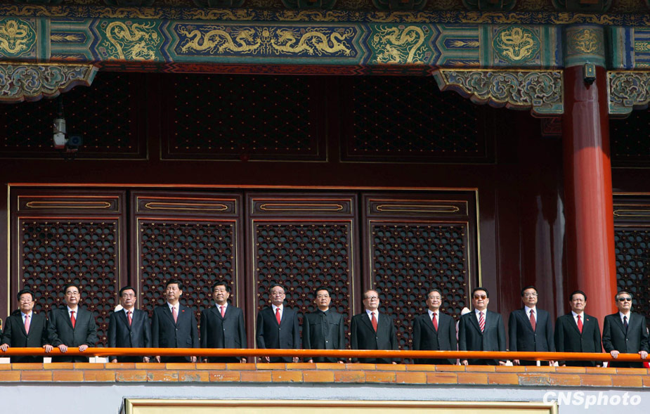 2009年10月1日,中華人民共和國(guó)成立60周年慶祝大會(huì)在北京天安門(mén)廣場(chǎng)舉行。圖為胡錦濤等黨和國(guó)家領(lǐng)導(dǎo)人在天安門(mén)城樓上閱兵。中新社發(fā) 杜洋 攝