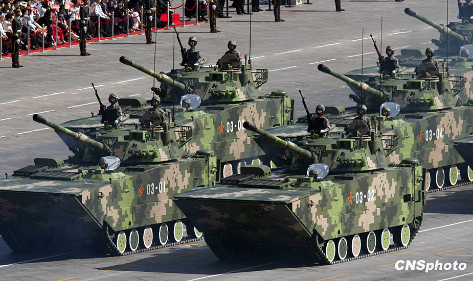 2009年10月1日,中華人民共和國(guó)成立60周年慶祝大會(huì)在北京天安門(mén)廣場(chǎng)舉行。圖為兩棲突擊車方隊(duì)。中新社發(fā) 趙振清 攝