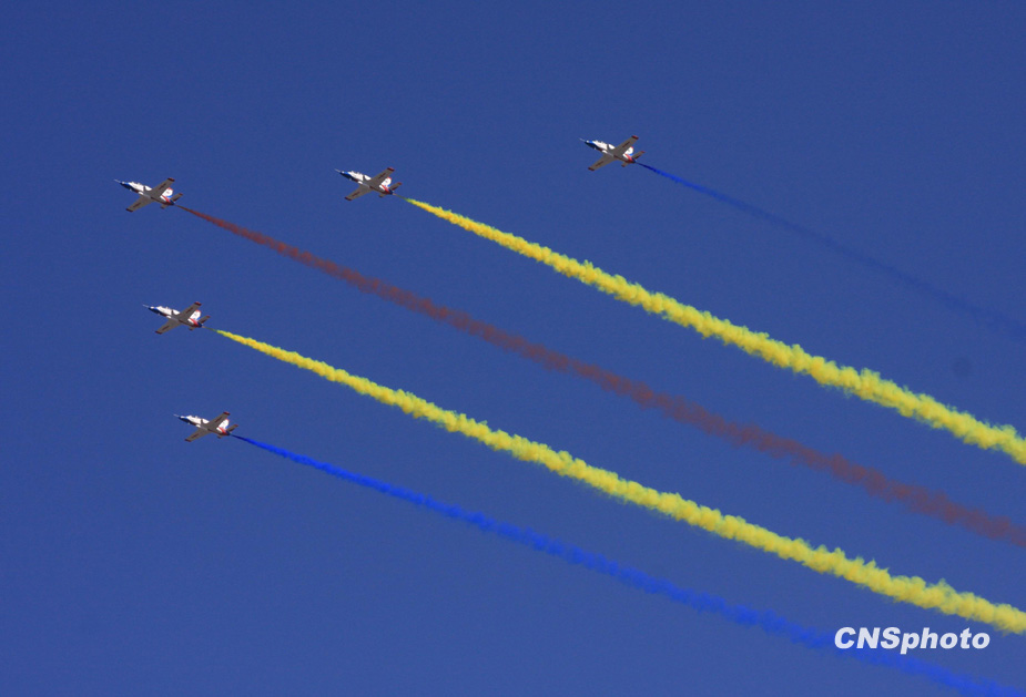 2009年10月1日,中華人民共和國(guó)成立60周年慶祝大會(huì)在北京天安門廣場(chǎng)舉行。圖為教練機(jī)梯隊(duì)飛過天安門廣場(chǎng)上空。中新社發(fā) 郭國(guó)權(quán) 攝