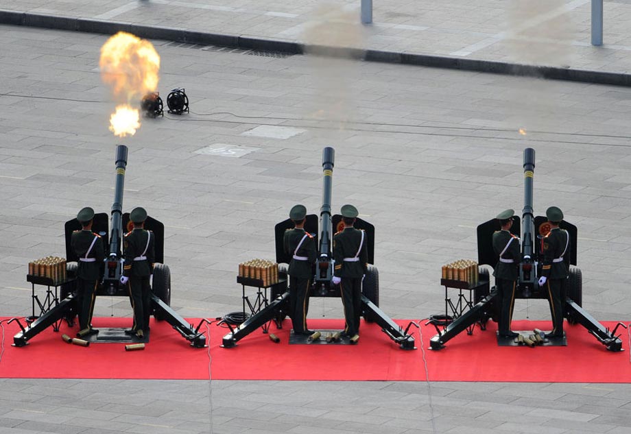 2009年10月1日,中華人民共和國(guó)成立60周年慶祝大會(huì)在北京天安門廣場(chǎng)舉行。圖為國(guó)慶慶典禮炮在天安門廣場(chǎng)鳴響。圖片來(lái)源:新華網(wǎng) 任勇 攝