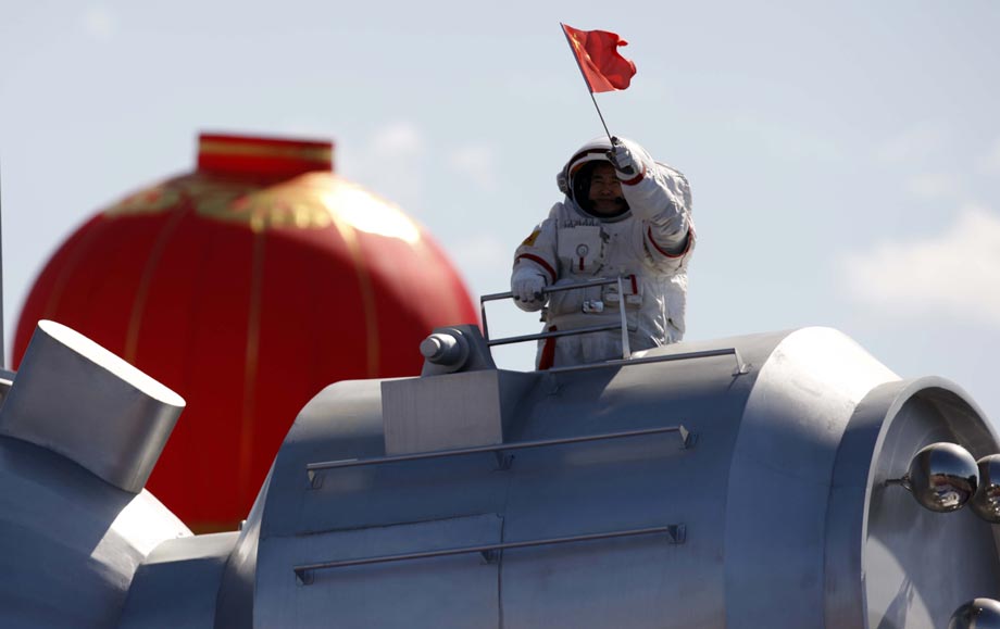 10月1日,中華人民共和國(guó)成立60周年慶祝大會(huì)在北京舉行,航天員翟志剛等航天人在群眾游行隊(duì)伍中亮相。 中新社發(fā) 盛佳鵬 攝