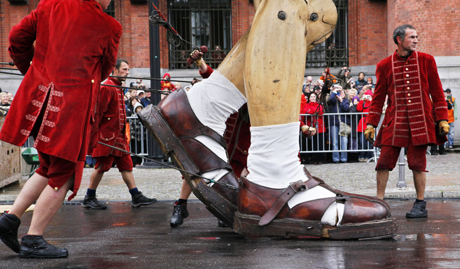 10月2日,來自法國一家戲劇公司的兩個巨型提線木偶亮相柏林街頭,它們將在露天劇場進行表演,以此紀(jì)念柏林墻推倒20周年。圖片來源:中國新聞網(wǎng)