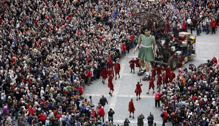 10月2日,來自法國一家戲劇公司的兩個巨型提線木偶亮相柏林街頭,它們將在露天劇場進行表演,以此紀(jì)念柏林墻推倒20周年。圖片來源:中國新聞網(wǎng)