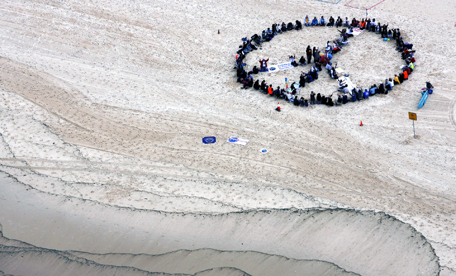 10月4日,一個在全球范圍內祈求和平的活動在多個國家展開,呼吁結束戰(zhàn)爭、消除核武器和結束各種暴力行為。在澳大利亞悉尼附近的海灘上,參加和平游行的人組成和平圖案。來源:中國新聞網(wǎng)