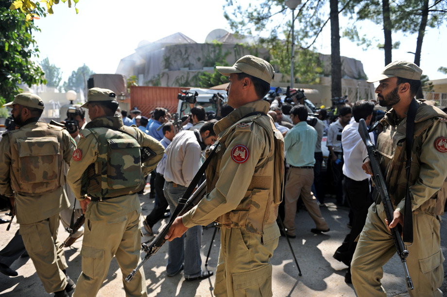 中新網(wǎng)10月5日電 據(jù)法新社報道,聯(lián)合國位于巴基斯坦伊斯蘭堡的辦公樓內(nèi)5日發(fā)生自殺式襲擊爆炸,導致3人死亡。報道稱,當時有80人在該辦公樓工作,遇害者中包括一名外國人,另外2人是巴基斯坦婦女。還有6名傷者被送往醫(yī)院。圖為安全人員在發(fā)生爆炸的辦公室附近警戒。