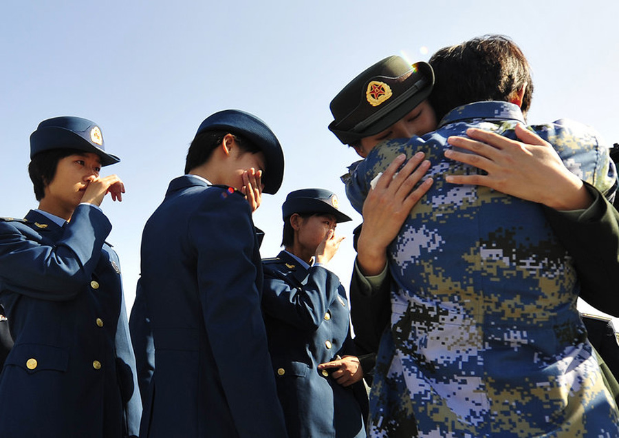 三軍女兵這些閱兵場上的鐵娘子,此時(shí)只有離別的悲傷。10月5日,北京沙河閱兵村,參加國慶60周年大閱兵的14個(gè)徒步方隊(duì)分批次撤離閱兵村,回到位于全國各地的建制部隊(duì)單位。在一曲曲送戰(zhàn)友、祝福等歌曲中,戰(zhàn)友們揮淚告別。陳杰/CFP