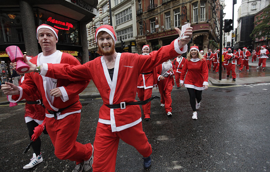 10月6日,英國倫敦市中心100多位圣誕老人為籌集乳腺癌護理善款而參加歡樂跑活動。圖片來源:中國新聞網(wǎng)