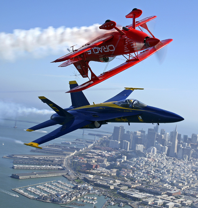 2009年10月8日,美軍飛機(jī)在舊金山灣上空進(jìn)行飛行演練。一年一度的舊金山艦隊(duì)周將于10月10日開幕,屆時(shí)會有船艦游行和飛行表演等活動。 來源:中國新聞網(wǎng)