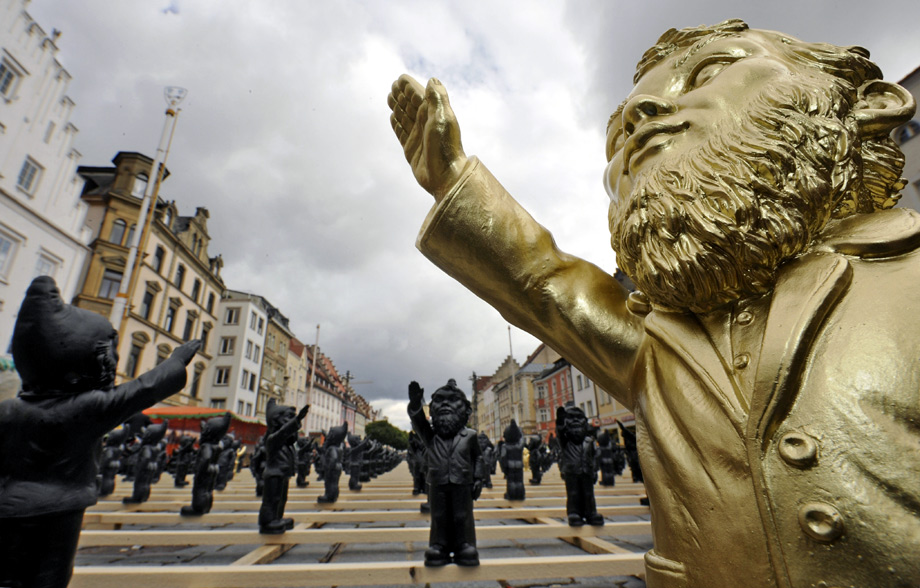 10月14日,德國施特勞賓市街頭擺放了1250個(gè)行納粹禮的花園土地神像,“行納粹禮的花園土地神”其實(shí)是一款雕塑作品,是由59歲的德國藝術(shù)家奧特馬爾·赫勒爾創(chuàng)作的目的在于提醒人們警惕法西斯思想,反對使用法西斯思想控制大眾。