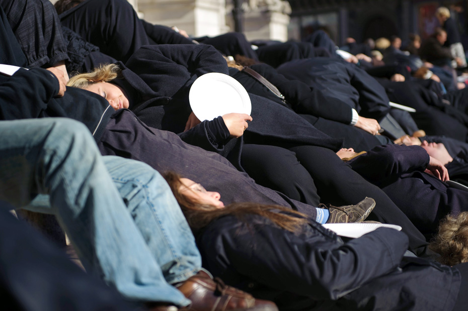 10月15日,示威者身穿黑色衣服、手持空盤子在巴黎歌劇院前抗議。他們此舉是為了呼吁人們關注世界上的饑民。圖片來源:中國新聞網(wǎng)
