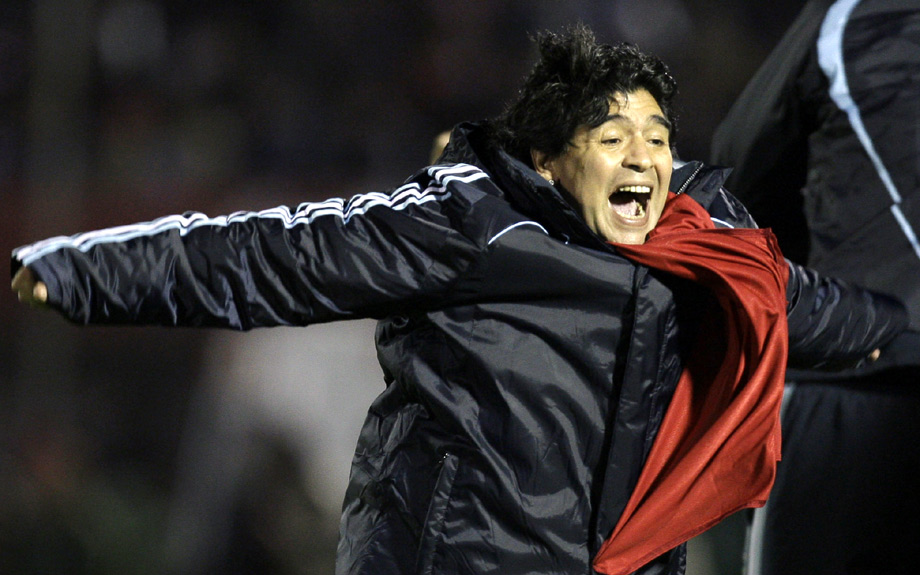 周四(10月15日),2010南非世界杯南美區(qū)預(yù)選賽最后一輪比賽中,阿根廷1-0取勝烏拉圭,正式進軍南非世界杯,阿隊主教練馬拉多納狂喜不已。圖片來源:中國新聞網(wǎng)