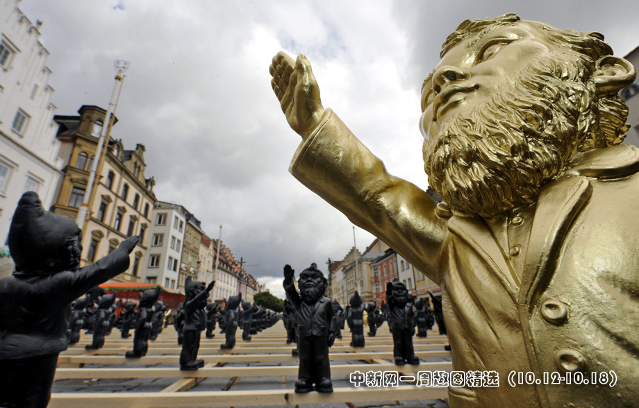 10月14日,德國施特勞賓市街頭擺放了1250個“行納粹禮的花園土地神”,目的在于提醒人們警惕法西斯思想,反對使用法西斯思想控制大眾。圖片來源:中國新聞網