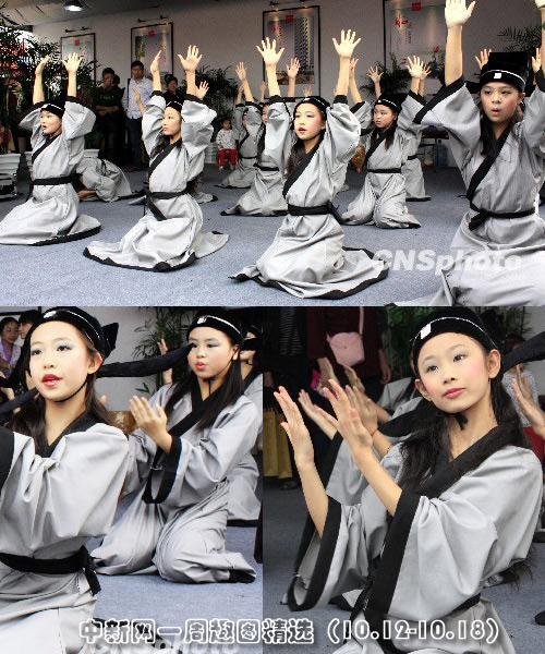 10月15日,2009年湖北宜昌秋季房地產(chǎn)交易會(huì)開(kāi)幕,一家房地產(chǎn)公司還請(qǐng)來(lái)小學(xué)生現(xiàn)場(chǎng)進(jìn)行國(guó)學(xué)表演,吟唱“三字經(jīng)”,為房交會(huì)增添文化氣息。圖片來(lái)源:中國(guó)新聞網(wǎng)
