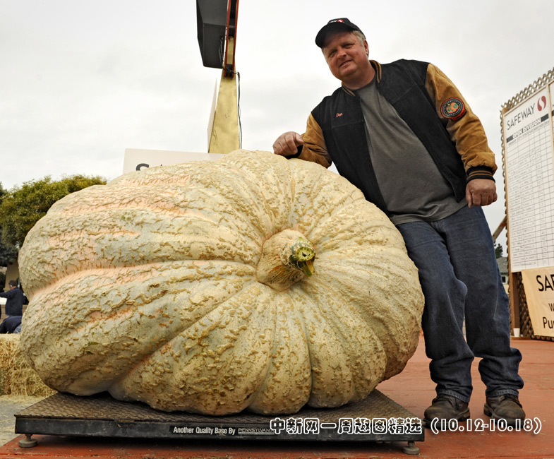 10月12日,美國(guó)加利福尼亞州農(nóng)場(chǎng)主Don Young種植的南瓜以1658磅(約752.06公斤)打破世界紀(jì)錄。圖片來源:中國(guó)新聞網(wǎng)