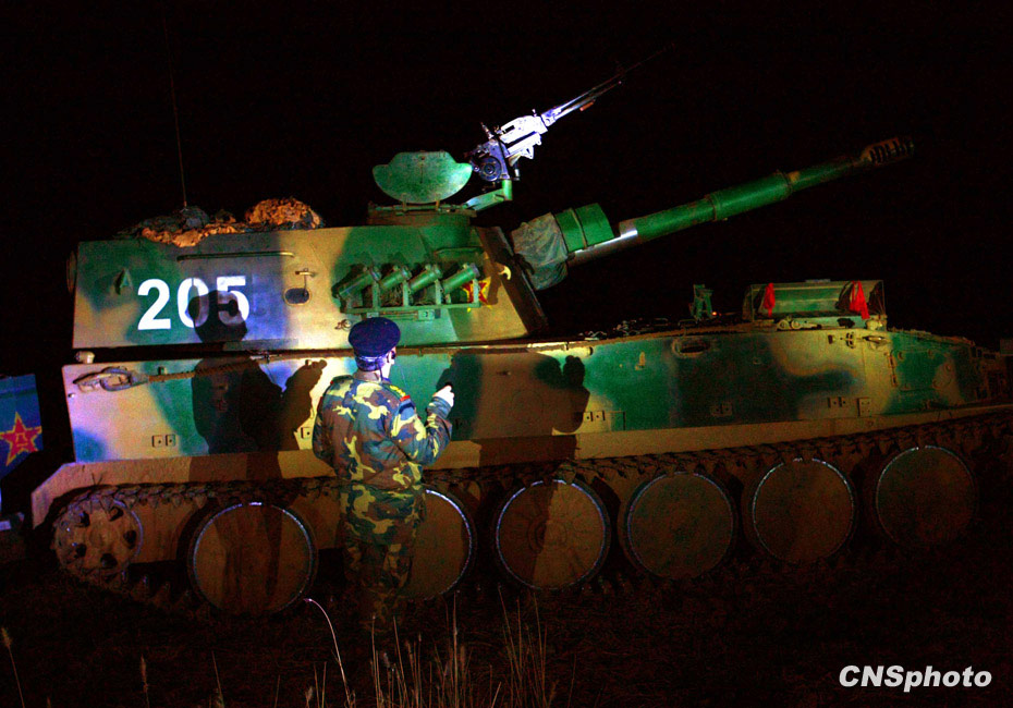 當(dāng)晚國防大學(xué)防務(wù)學(xué)院、空軍指揮學(xué)院的外軍學(xué)員,以及英國、以色列、土耳其、巴基斯坦等國軍事觀察員親臨現(xiàn)場(chǎng)觀摩了后勤保障戰(zhàn)斗準(zhǔn)備、自行榴彈炮占領(lǐng)陣地、裝甲車輛“摸黑”開進(jìn)等戰(zhàn)斗要素。中新社發(fā) 宋吉河 攝