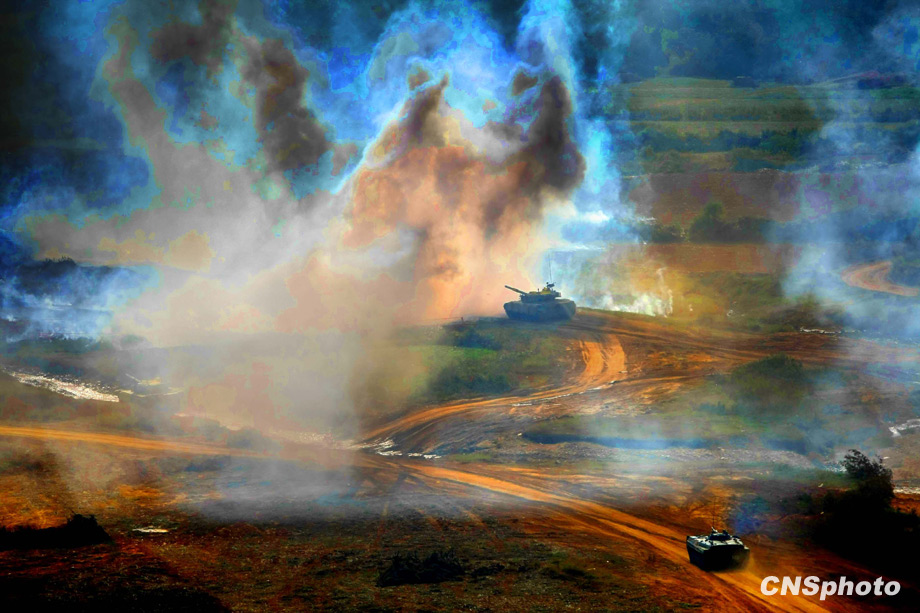 解放軍“前鋒-二00九A”演習,二十二日在濟南軍區(qū)某合同戰(zhàn)術訓練基地進行陸空聯(lián)合火力打擊實兵實彈演練。中新社發(fā) 宋吉河 攝
